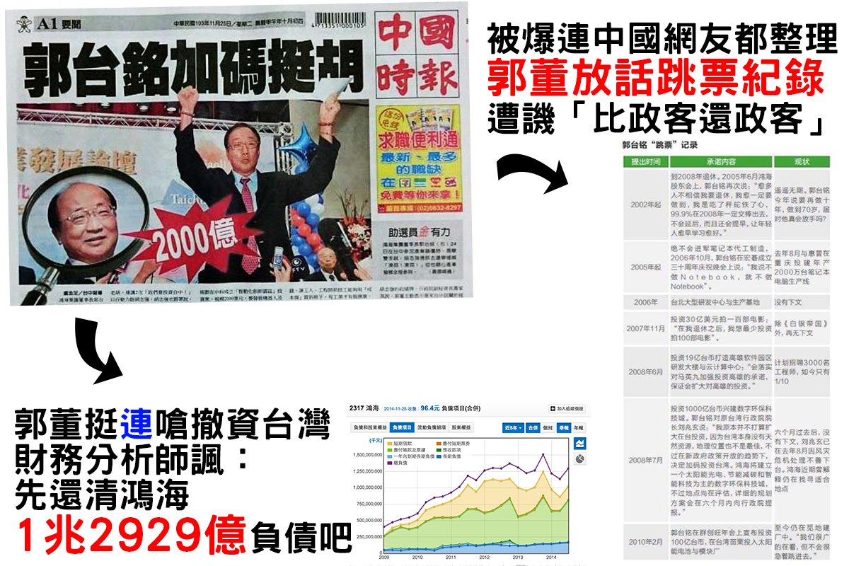 面對郭台銘的放話,財金文化董事長謝金河表示:「鴻海郭台銘站出來呼籲經濟選民投連勝文一票,並揚言要離開台灣。每一次選舉都有企業大亨跳出來恐嚇經濟選民,上一次是王雪紅,但是她的宏達電卻從1300元跌到118元,今天她旗下的威盛又打入全額交割,股民傷筋挫骨,慘不忍睹!」郭正亮同樣對鴻海郭台銘的恐嚇不以為然,撰文指出:「郭台銘所以讓台灣民眾越來越反感,主因是鴻海集團『債留台灣、投資生產在海外』的經營模式,對台灣經濟的傷害已經越來越明顯。鴻海集團的主要特色有三:一、多數投資生產,幾乎都設置在海外。二、多數企業盈餘,幾乎都保留在海外。三、多數就業人口,幾乎都創造在海外。以2012年為例,光是鴻海中國就僱用超過80萬人,但在台灣僱用人數只有7000人,只佔鴻海集團總僱用人數的0.87%!不管是擴大投資、擴大生產、擴大僱用,幾乎都以大陸市場為主,但不管是擴大舉債或擴大融資,卻都以台灣為基地。這種以台灣資金『不斷擴大大陸生產,不斷創造大陸就業』的經營模式,不但對台灣的產業升級貢獻有限,甚至對台灣的長期經濟發展恐怕也未必有利。」獵豹財務長郭恭克在部落格上發表一篇「郭董,請先清償您在台灣的負債吧!」他發現鴻海在台灣的母公司,不僅沒有創造任何淨現金流入,在2013年負債比率甚至從原本的42.48%提高至61.84%,可稱是台灣民營企業負債總額最高的公司,到2014年第三季總負債達到1.29兆員。郭恭克因此向郭台銘喊話,「郭董是否想從台灣撤資,我無權置喙,但我多少有少少的存款在台灣的金融體系,有個小小請求,請先清償您在台灣的負債吧!」而對郭台銘放話加碼投資,陳為廷轉貼中國網友整理的郭台銘「選舉支票跳票紀錄」,並指出「郭享有那麼多補貼、租稅減免,但產線根本大多在中國、提供給台灣的就業機會不到5000人,平均下來,還不及一般中小企業」,因此氣憤嗆聲「比起一個企業應有的貢獻,郭台銘欠台灣人的實在太多了。幹,你大聲個屁!」