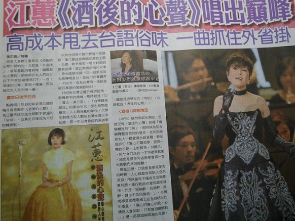 台灣《中國時報》一篇關於台語歌星江蕙的報道在網絡上惹起族群爭議。該題為「江蕙《酒後的心聲》唱出巔峰」的報道,下面有一條「高成本甩去台語俗味 一曲抓住外省掛」的副題。「台語俗味」一詞惹起不少台灣網民不滿,認為「中時」的報道打壓台語族群,向「外省人」背景的讀者或官方獻媚,暗藏「外省人」的菁英心態。