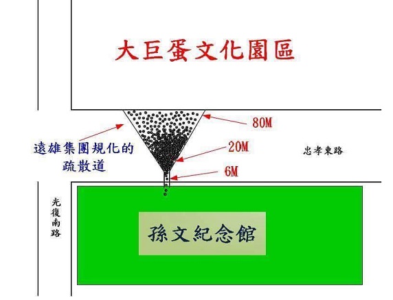 然後我拜託你用腦子想一想,在充滿車流人流的忠孝東路、光復南路上,那一塊地方,現在如果有飯店、有購物中心、有百貨公司、有電影院、有洽公司的辦公室,一旦辦理大賽、有五萬人在裡面,突然發生火警、地震,一群人蜂擁往外衝,往地下道衝,往忠孝東路衝。你覺得人踩人、踩死人的悲劇真的不會發生嗎?