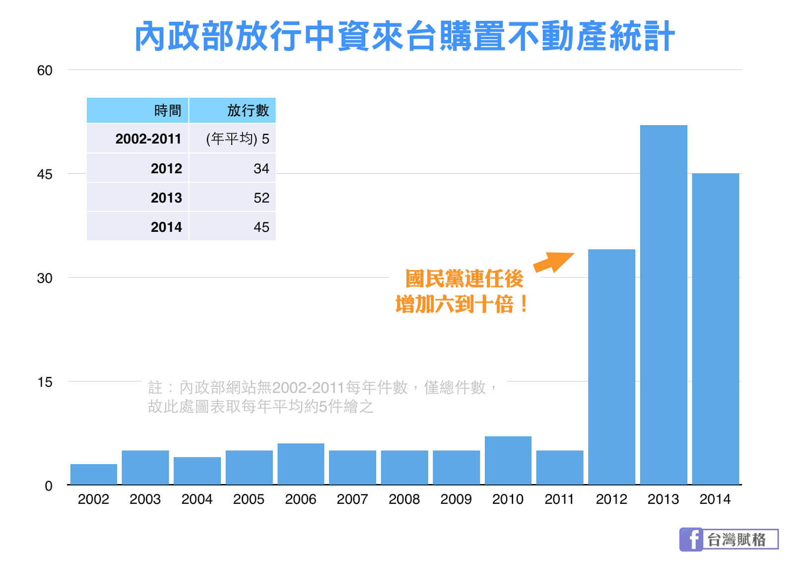 最近九點二趴網軍在網路上散佈「國民黨幫忙管制中資炒房」的假消息,然而事實上,根據內政部的中資來台購買不動產統計,2002年到2011年總計十年間中國人來台購買的不動產,還沒有馬政府2013一年開放的量多!而且2009年以後馬政府開放中資來台投資,更增加中國資本來台炒作房地產的誘因和機會!