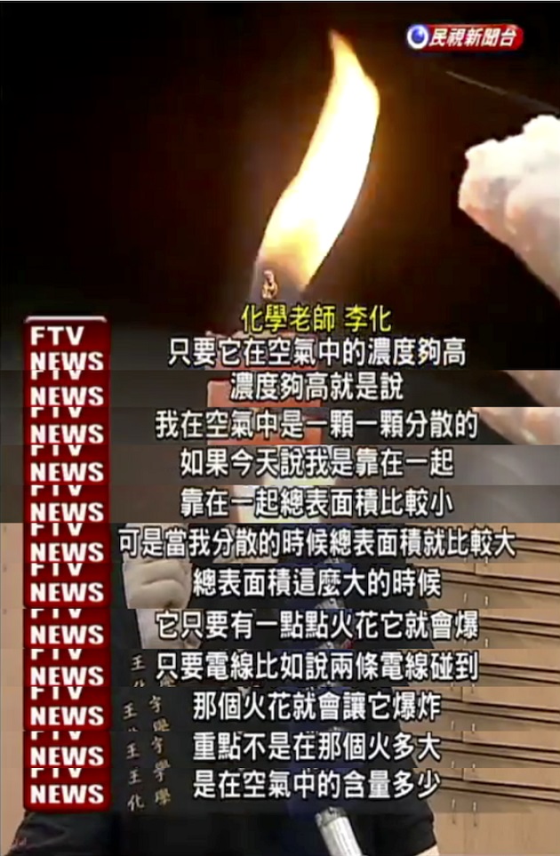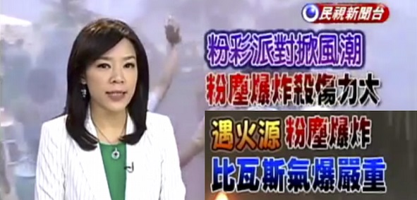 三個月後, 有媒體還在搞民粹 ... ▼ 民視新聞2013年9月報導,粉塵爆炸可能比瓦斯氣爆還嚴重。 ▼ TVBS 2013年12月針對高雄市政府禁灑彩粉乙事,抨擊是在掃興擾民! ▼ 當初就有化學老師提醒粉塵爆炸的關鍵不是火有多大,而在於空氣中的含量與濃度。 ▼ TVBS在2014年6月28對彩色泳池趴的報導