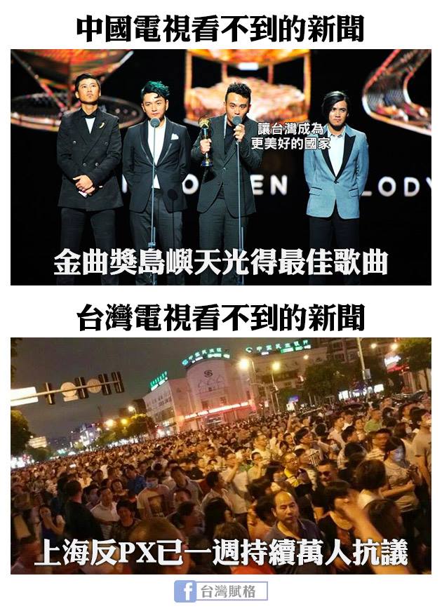 上海連續7天反PX 警拘毆大量市民嚴控網絡 http://bit.ly/1g4I57L 同場加映中國電視才會看到的,到現在還找邱毅作特別來賓評論台灣時政: https://youtu.be/0uoQLNpYCmQ?t=16m10s