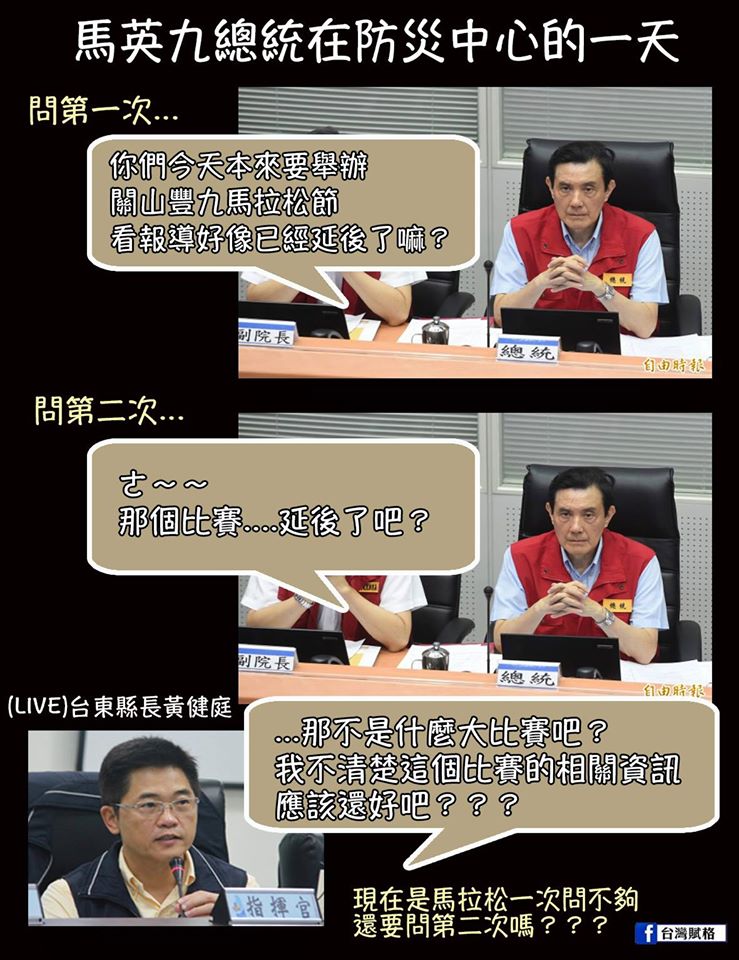 【颱風天當然要關心馬拉松,不然要幹嘛?】 小編:其實你心裡想的是慢跑跟紅豆餅吧~~ ----- 馬英九防災只關心馬拉松? 民眾:不知所云 http://www.setn.com/News.aspx?NewsID=88947