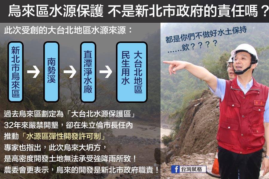 這次大台北的黃水水源主要來自新北市烏來區,當朱立倫市長勘災高聲疾呼「國土保育要重新檢討」的同時,忘記自己是開放水源保護區開發的推手嗎?