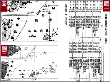 圖一:這是戰後中華民國政府接管台灣之後,由台灣行政長官公署編印的《台灣民政》第一輯裡面介紹「台灣省各縣市位置一覽表」,其中並沒有包括釣魚台。從經緯度看,表中所列的台灣最東是東經122°6’20"E,而釣魚台位於東經123°34’21"E,不在其範圍內。