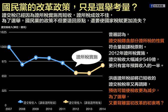 【說好的稅制改革呢?又是為了選舉的假改革嗎?】 立法院的會期又開始了,國民黨提出了「洪版證所稅」,要改革馬政府現行看似失敗的證所稅。 證所稅的改革,除了應符合租稅正義的精神外,還需要對國家財政有幫助、建立務實的稽徵機制。 2012年馬政府推行的證所稅,不但對台灣的股市造成衝擊,使股市成交量萎縮,連社會普遍認為已含有證所稅性質、課徵較穩定的證交稅,也連帶受到影響而減少。接近大選的這個會期,國民黨推出的版本,不但是回到原點甚至更後退,還有可能使稅收更為減少,等同打了當初掛在改革大旗上的「租稅正義」一巴掌,政府的公共政策難道又是被國民黨拚選舉綁架嗎? --- 參考資料: 「證所稅」吵什麼? 藍綠版本圖解 http://www.appledaily.com.tw/realtimenews/article/new/20150915/691797/ 林全:洪秀柱版證所稅 退過頭了 http://newtalk.tw/news/view/2015-08-18/63606 證所稅影響評估報告 - 中華民國證券商業同業公會 http://goo.gl/qyE7bc