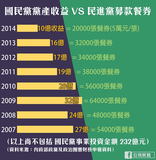 【募款 vs. 黨產】 猜猜看,民進黨要賣多少張餐券,才能和國民黨一年的黨產收益打平? 答案是:至少2萬張。 --- 蔡募款小額佔99% 洪辦:5萬餐券呢 http://www.appledaily.com.tw/appledaily/article/headline/20150918/36785201/ 洪營募款5千萬 柱姐︰很羨慕小英 http://iservice.ltn.com.tw/2015/specials/election/news.php?rno=1&type=paper&no=916480 民調/國民黨黨產多 85%認定政黨競爭不公平 http://news.ltn.com.tw/news/politics/paper/908548 內政部政黨及政治團體財務申報資料 http://www.moi.gov.tw/dca/03caucus.aspx