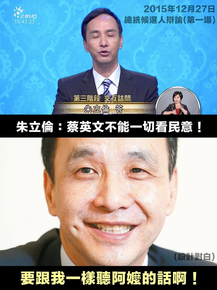 朱立倫竟然說不能一切看民意,民選總統不看民意,不然是要跟你一樣只看阿嬤嗎? #雖然是聽阿嬤的話還是覺得立倫有點獨裁啊 --- 交叉詰問四》朱立倫批蔡英文 「不能一切看民意」 http://news.ltn.com.tw/news/politics/breakingnews/1553103