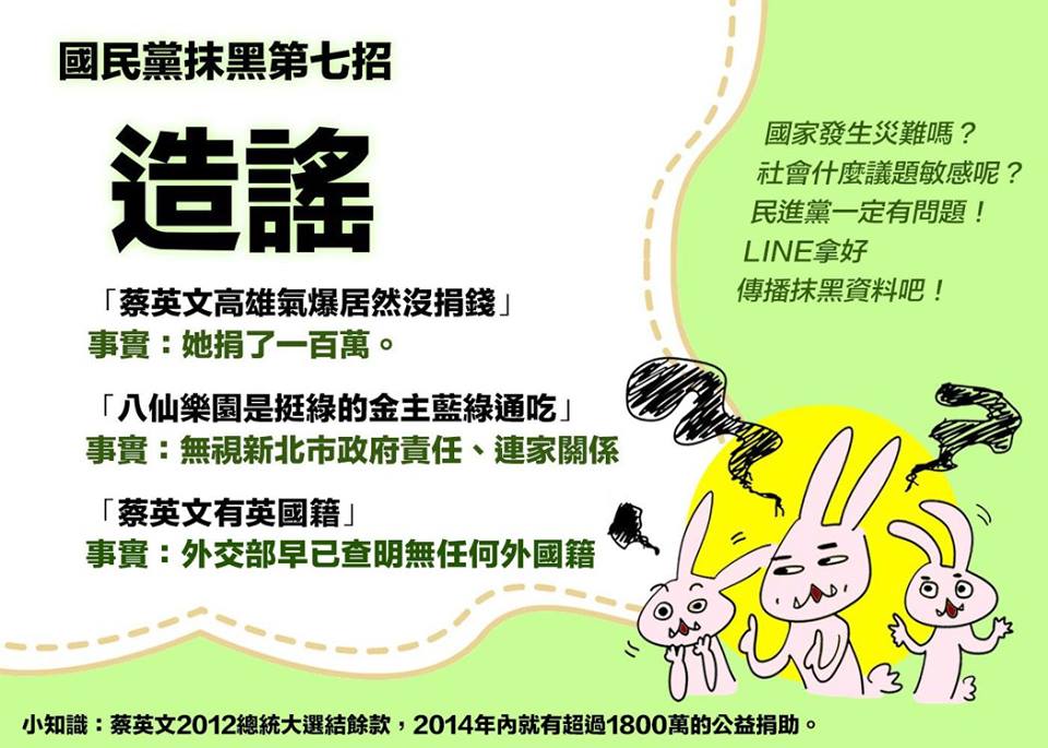 【國民黨抹黑第七招:造謠】 現在流行說謊不查google了嗎?像是高雄氣爆有沒有捐款這種用google就查得到的,也可以抹黑攻擊對手。最新的謠言,竟然連蔡英文有英國國籍都出來了!但是外交部早就已經查過沒有這個問題,再次提醒選舉期間用不實傳言抹黑造謠是會觸法的喔! --- 爆蔡英文有英國籍 民進黨上警局告網友 http://www.appledaily.com.tw/realtimenews/article/politics/20151228/762723 又見抹黑!網傳小英塵爆沒捐款 民進黨秀明細駁謠言 http://www.setn.com/News.aspx?NewsID=83312
