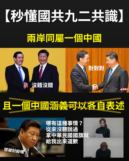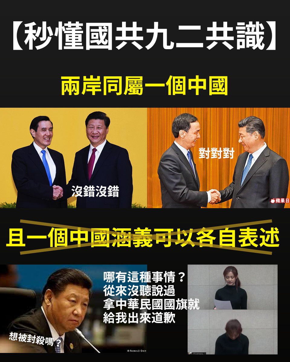 事實證明,九二共識就是謊言,承認了九二共識,就是拉台灣人民落入兩岸同屬一個中國的陷阱! 「面對中共的一中框架,你可以迴避、拒絕、否認、閃躲、不理會、不回應,就是不能承認。路上有一坨狗屎,你可以拒絕、迴避、閃躲、繞路,就是不能他媽的踩下去。」(by sobigbird @ http://disp.cc/b/163-8FN8 ) 中國政府一直逼蔡英文接受九二共識,現在大家可以看懂為什麼了嗎? 周子瑜國旗事件道歉影片 https://www.youtube.com/watch?v=t57URqSp5Ew 新聞來源: 馬總統:九二共識是兩廂情願 http://udn.com/news/story/7853/870507 朱立倫:沒92共識現狀無法維持 http://www.chinatimes.com/newspapers/20151019000680-260301 馬英九:兩個中國、一中一台或台灣獨立 皆不符憲法規定 http://www.nownews.com/n/2013/11/11/1016678