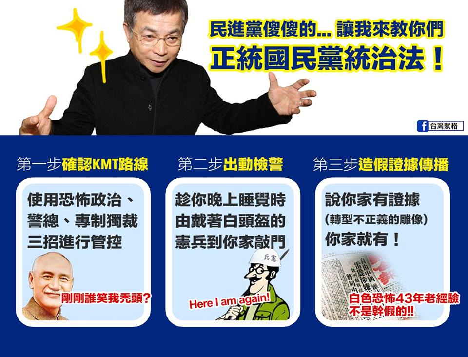 【賴士葆推薦 國民黨的統治心法】 第一步:確認KMT獨裁統治路線 第二步:晚上出動憲兵檢警把你帶去泡茶 第三步:造假證據逼你蓋章 #葆葆知道國民黨怎麼獨裁統治但葆葆不說 #葆葆不說小編幫你說 --- 談促轉條例 賴士葆:小心晚上睡覺憲兵敲門 http://goo.gl/cYelX2 【島嶼邊緣】綠色警總、綠色恐怖? 陳文成命案告訴台灣人何謂警總與恐怖! http://goo.gl/Ng7p6o