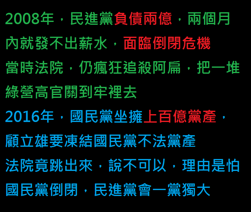 民進黨要倒閉時,法院瘋狂追殺民進黨高官,完全不怕國民黨一黨獨大 國民黨坐擁上百億不法黨產,法院就護航,說凍結黨產,民進黨會一黨獨大 法院不允許凍結國民黨黨產,理由竟是怕民進黨一黨獨大 http://news.tvbs.com.tw/local/702600