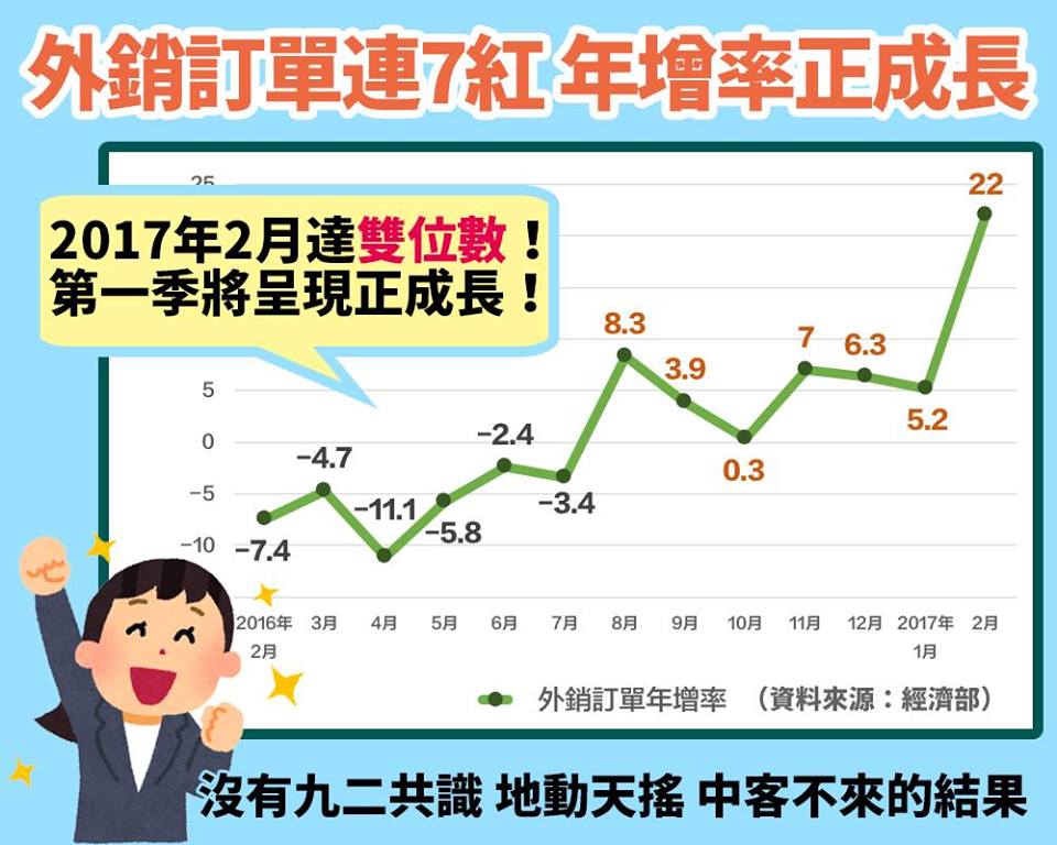 【九二共識與中客不來恐成外銷連七紅主因?】 經濟部2017年3月20日公布最新外銷訂單數據,2月外銷訂單337.5億美元、年增22.0%,連續7個月正成長! 想到國民黨最愛講要拚經濟,拚經濟拚到負字滿滿,還好意思講633,不知拚到誰的荷包去了? 看來沒有九二共識、沒有中國團客的入侵,台灣人活得比較好! #執政不能只靠一張嘴 #廠廠 外銷訂單連7紅 年增達雙位數 https://goo.gl/HYZ6YJ 經濟部:106年2月外銷訂單統計 https://goo.gl/CEIm2P