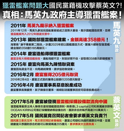 【馬英九政府主導的獵雷艦案,現要蔡英文出面負責?! 】 2011年12月,馬英九參加完造船業者組成之造勢大會後,裁示國艦國造政策,並將獵雷艦案列入2012年競選支票中。之後獵雷艦案建案,金額高達358.5億元,並由無大規模造艦技術的慶富造船得標,並在向馬英九陳情後,取得205億聯貸。 2017年,慶富造船被發現將採購款項流向中國,並爆發詐貸等問題。國民黨立委竟衝出來開記者會,要求蔡英文不要躲了!出面負責?! #這已經不是秀下限可以形容的了 #獵雷艦 #國艦國造 #慶富 【相關新聞】 獵雷艦遭染紅 呂玉玲籲:蔡英文出來面 不要再躲 https://newtalk.tw/news/view/2017-05-05/86005 獵雷艦案 慶富董事長父子坦承詐貸 http://news.ltn.com.tw/news/politics/paper/1126047 【獨家】慶富又遭踢爆!獵雷艦採購設備款 竟流向澳門 http://www.upmedia.mg/news_info.php?SerialNo=16179 PTT stevenjeff [爆卦] 350E 獵雷腱的坑貧夢 Dream 懶人包 https://goo.gl/DrqI4Y 馬考量選票 獵雷艦從冷宮變首選 http://www.storm.mg/article/26064/2 【時間表】 ・2011年 馬英九裁示納入獵雷艦案 2011年12月,馬英九參加完造船業者組成之造勢大會後,裁示國艦國造政策,並將獵雷艦案列入2012年競選支票中。 ・2013年 國防部獵雷艦案建案,金額高達358億元! 海軍推「康平專案第二階段」,計畫2025年前以國艦國造方式,籌獲六艘新型獵雷艦,總金額約358億5185萬餘元。 ・2014年 慶富造船得標獵雷艦案 慶富沒有大規模造艦技術,連船塢都不足,財政狀態不佳,卻取得358億元鉅額標案?! ・2015年 慶富向馬英九陳情聯貸案 慶富因為資金不足,向馬總統陳情,請求協助聯貸案。 ・2016年2月 慶富獲得205億元聯貸 2016年2月4日,慶富正式簽約獲得公股銀行205億元聯貸。 ・2016年4月 慶富董事長惡意脫產成功 慶富董事長陳慶男,其子陳偉志董事,媳婦彭詩麗董事因官司惡意脫產成功。 ・2017年5月 慶富被發現獵雷艦採購設備款流向中國 獵雷艦專案原主持人陳偉志違背國艦國造原則,與香港L3 capital公司和英屬維京群島OCEAN KIRIN公司簽訂採購聲納等設備合約,匯款非合約帳戶高達310萬美元。 ・2017年5月 國民黨竟召開記者會要求蔡英文負責?! 國民黨立委呂玉玲、馬文君召開記者會痛批,慶富公司疑似洗錢把錢匯往中國,並質疑慶富只憑國防部合約就可以聯貸高達205億元,要求蔡英文出面負責。