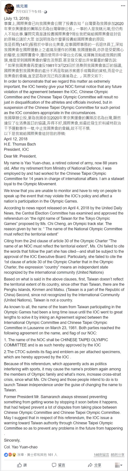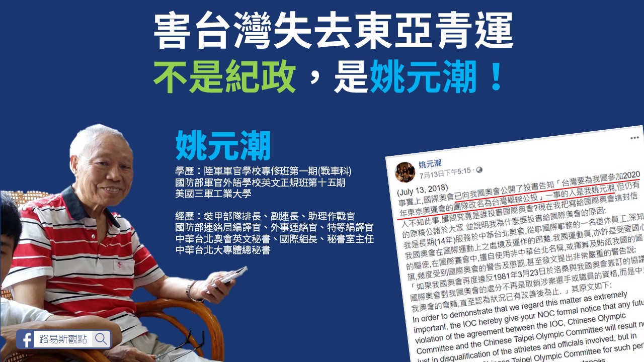 姚元潮身為軍方背景理應投入軍事相關活動,但卻藉由外語專長霸佔中華奧會相關職缺,難怪網友大批,這樣的人砍了年金實在合情合理,姚元潮身為一個軍人希望做是能敢做敢當,不是關閉了臉書就沒這回事。