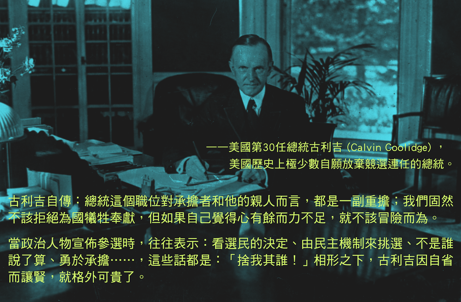 今天是美國第30任總統古利吉 (Calvin Coolidge) 的忌日,他是美國歷史上唯一一位出生於美國國慶日的總統;不過更值得記得的是,他也是美國歷史上極少數自願放棄競選連任的總統。另外一位是二次大戰結束時的杜魯門 (Harry Truman),還有一位是宣佈中止越戰的詹森(Lyndon Johnson) ,僅此而已。古利吉總統所以不拼連任,不是因為選情不妙怯戰,事實上繼任的胡佛 (Herbert Hoover) 也是共和黨提名,而且贏得了壓倒性勝利。在古利吉的自傳裡這樣說:「總統這個職位對承擔者和他的親人而言,都是一副重擔;我們固然不該拒絕為國犧牲奉獻,但如果自己覺得心有餘而力不足,就不該冒險而為。」