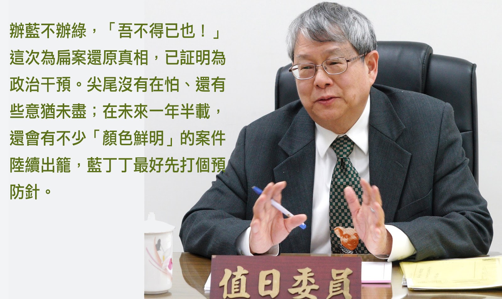 這一年多來,藍媒把尖尾形容為「辦藍不辦綠」,雖然是醜化挑撥的小人步,但也不能說完全亂講,因為會做出傷天害理的壞事的,除了「藍的」、你能找到一個「綠的」嗎?所以套句孟老夫子的話:辦藍不辦綠,「吾不得已也!」這次為扁案還原真相,証明政治干預,當然又坐實了「辦藍不辦綠」,不過尖尾不但沒有在怕、還有些意猶未盡;事實上,在未來一年半載,還會有不少「顏色鮮明」的案件陸續出籠,藍丁丁最好先打個預防針。