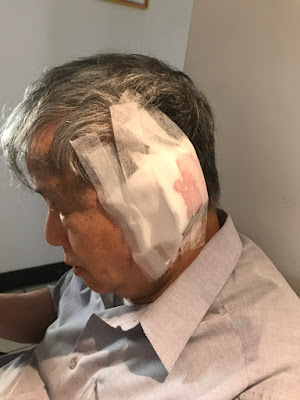 回頭先說明,這次手術分為兩階段進行(以下描述較血腥,兒童不宜)。第一階段只花了45分鐘,先割除那顆1.2x0.9x0.5公分的腫瘤,立刻冷凍切片送去化驗;约1小時後,發現是惡性,馬上躺回手術檯進行第二階段,再多切除周邊0.4公分範圍內的組織與軟骨,並且移來下方一小塊肌膚填補空洞,醫生說是為了避免尖尾自豪的耳朵優美造型走樣,這次則長達1小時45分鐘,才完成切割與縫合。