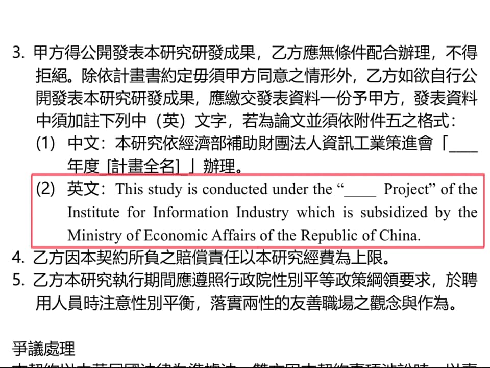 根據相同的承攬合約,專案產生的任何智慧財產,包括這篇期刊論文的著作權,皆屬於國家(經濟部)或資策會所有(附圖三)。在高虹安參與的這個專案,學術發表的著作權應屬經濟部所有。